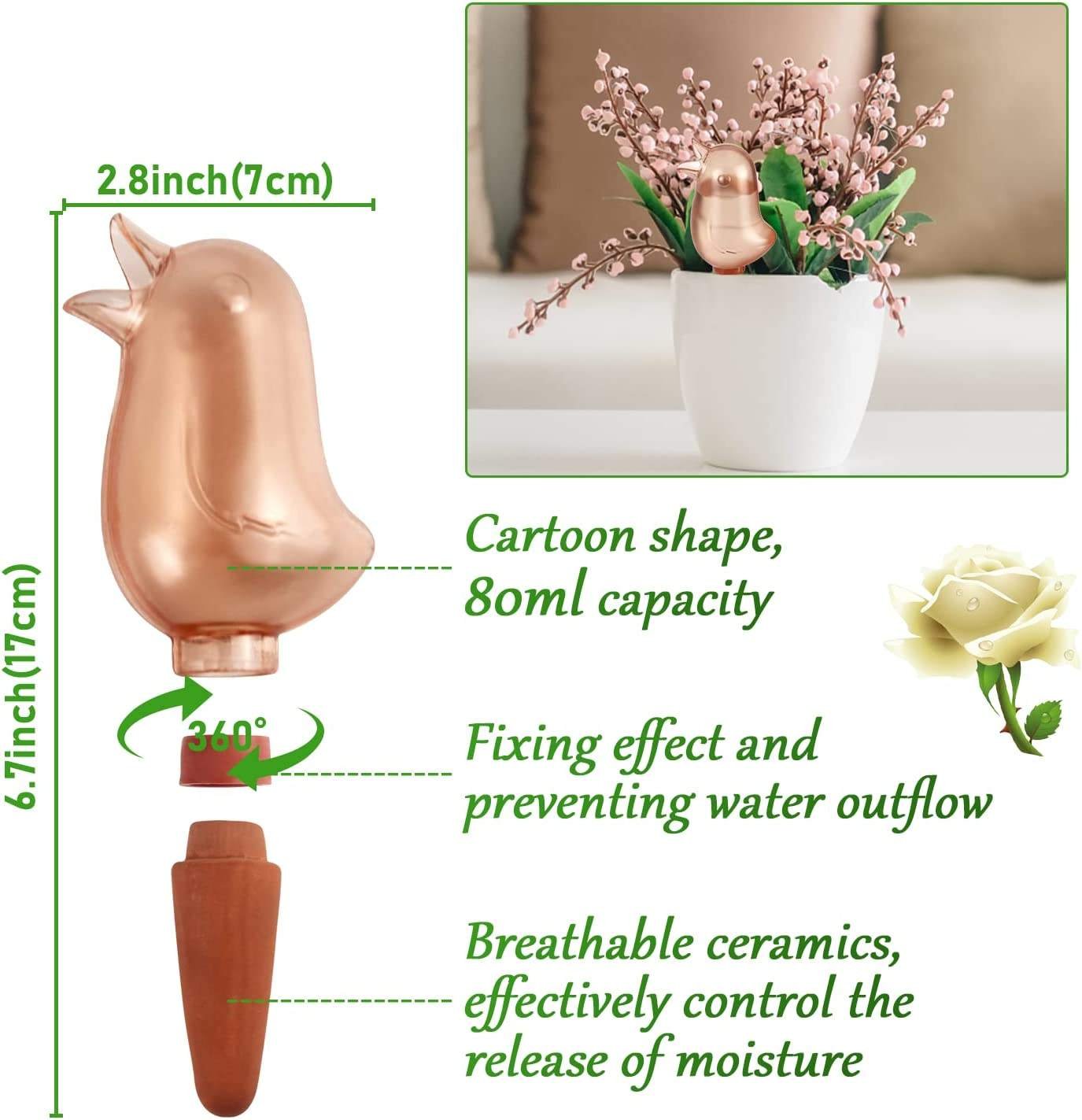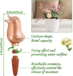 【Take care of your plants】: plant watering device, easy to use, can run for a long time after providing enough water to the birds. There’s no need to worry about water shortages for your plants when you’re at work or on vacation. 【FUNNY SHAPE】: automatic watering nails have a bird-shaped design shape, which is different from traditional unsightly irrigation equipment. Add ornamental value to potted plants and make children more interested in cultivation. It is the growth partner of the plant. 【Rational Irrigation】When the plant watering tip is full of water, it will release water in about 4-6 minutes. The terracotta material is effective against excessive release of moisture and ensures that it does not spill and cause plants to drown. Suitable for most small to medium plants 【Long time work】: The capacity of the automatic watering nail is about 80 ml, and it can continue to work for 4-6 hours after being filled with water. Even if the plants are short of water for a short period of time, the soil can be kept moist for a long time, and the plants can be taken care of for a long time. 【No harm to plants】The plant watering globe is made of terracotta clay, which is easy to clean and will not damage plant roots. Auburn is about 5.5 cm long and can stand firmly on plant soil without tipping